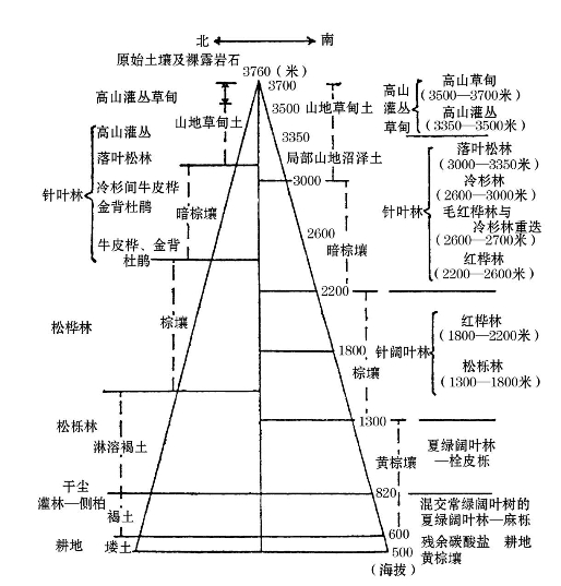 ◎秦岭南北坡垂直带谱(据《中国土壤》,科学出版社,1978年)