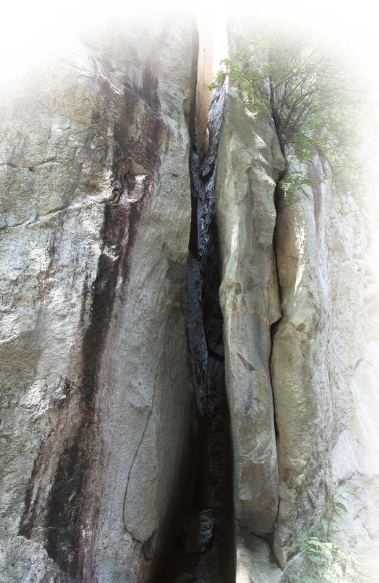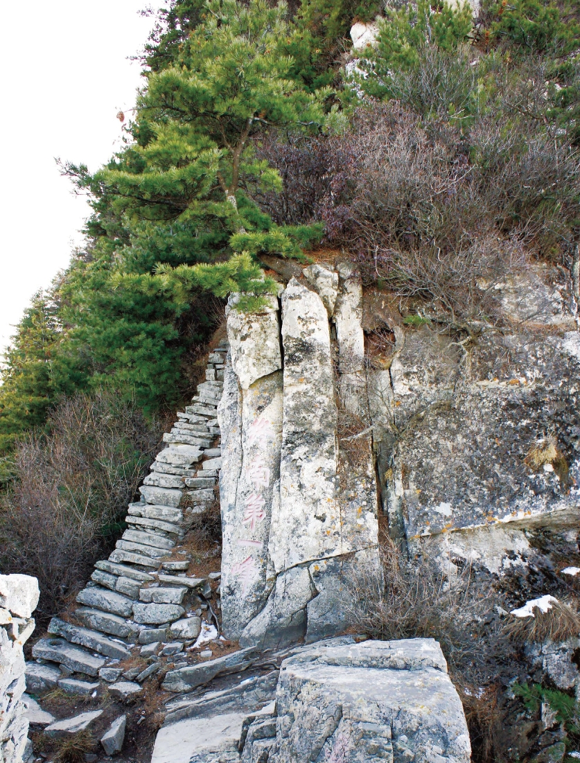 终南山是整个秦岭最为狭窄的地方,从山前峪口到达山脊的平面距离约为10千米,最窄处只有5千米。这里也是受南北地块挤压最厉害、地壳经受构造运动最为强烈的地段,因而岩层变质程度最深、岩石最为坚硬、花岗岩化最为普遍,原来的一些碳酸盐岩夹层也都经受深变质作用成了结晶颗粒粗大的白云石质大理岩。同时,由于地质构造力的作用,岩石内普遍发育了斜向的共轭节理。当长期遭受风化剥蚀之后,往往形成群峰并峙、悬崖峭壁,十分壮观,如位于石砭峪和太乙峪之间的峰峦、庙沟垴的南五台以及白道峪里的嘉午台等皆可作为杰出的代表。观察目前大地构造的大势,以整体的地貌视角,我们可以明显看出蓝田到商州的河谷带和东偏北而去的东秦岭带都是斜交的基本外在形式,大地挤压的作用或者表现为剪切,或者表现为隆升,都在终南山一带充分表现和展示。而漫山遍野的岩石剪切节理在古老的秦岭到处可见,在这里自然更为发育。