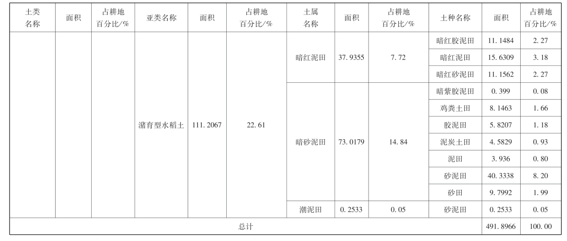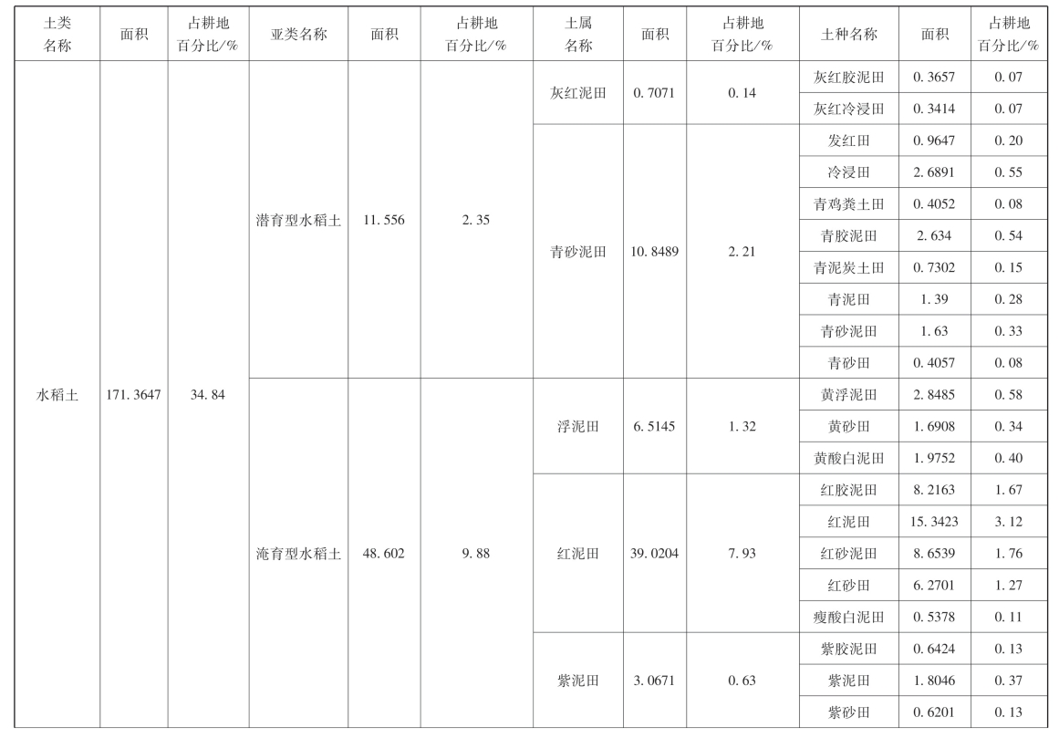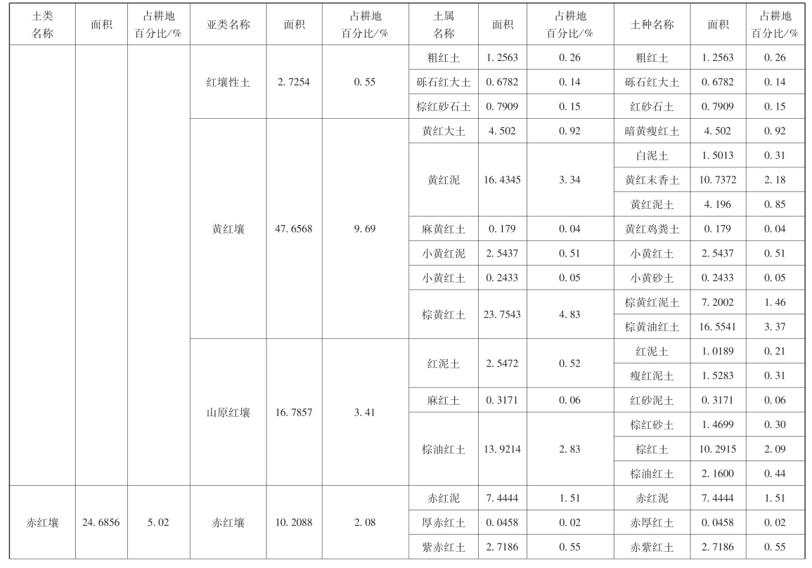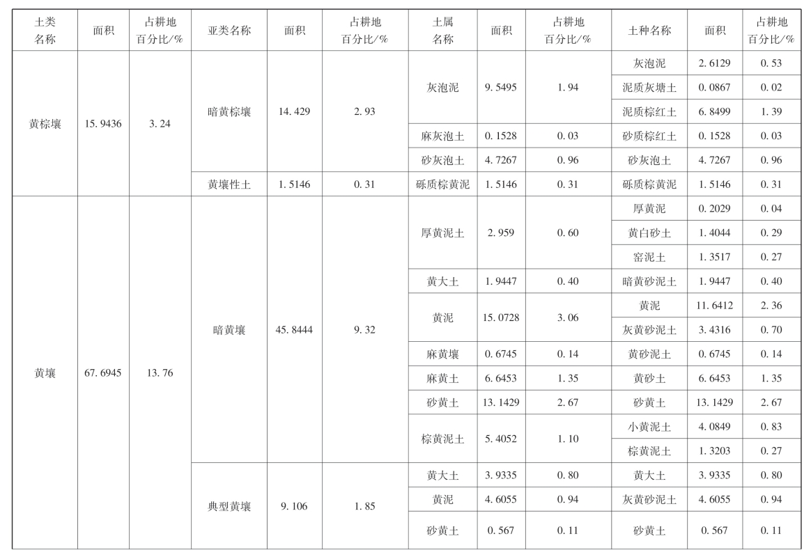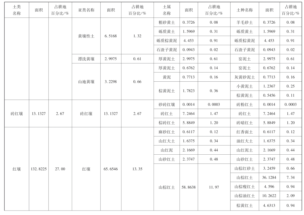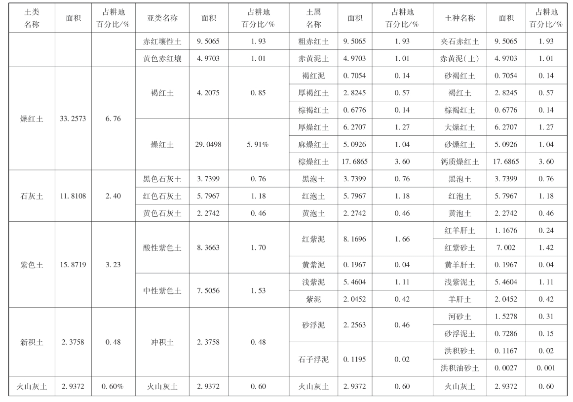 根据成土因素和土壤剖面特点,采用土类、亚类、土属、土种四级分类制,保山市耕地土壤共分为黄棕壤、黄壤、砖红壤、红壤、赤红壤、燥红土、石灰土、紫色土、新积土、火山灰土、水稻土等11个土类,27个亚类,71个土属,115个耕作土种。