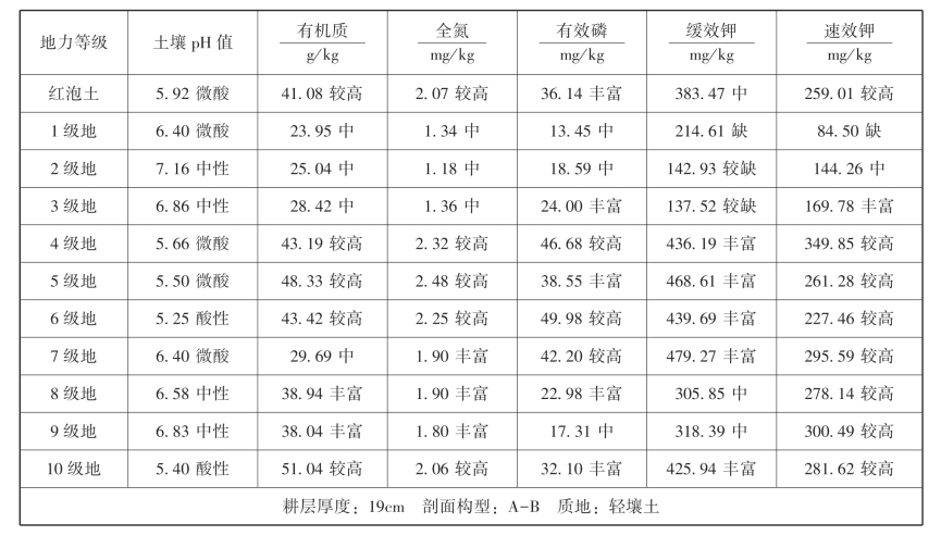 红泡土养分情况:呈微酸,有机质含量较高,全氮含量较高,有效磷含量丰富,缓效钾含量中,速效钾含量较高。