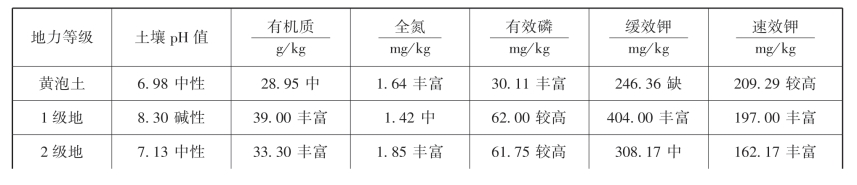 黄泡土养分情况:呈中性,有机质含量中,全氮含量丰富,有效磷含量丰富,缓效钾含量缺,速效钾含量较高。