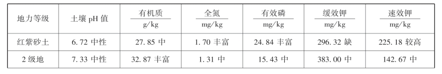 红紫砂土养分情况:呈中性,有机质含量中,全氮含量中,有效磷含量丰富,缓效钾含量中,速效钾含量较高。