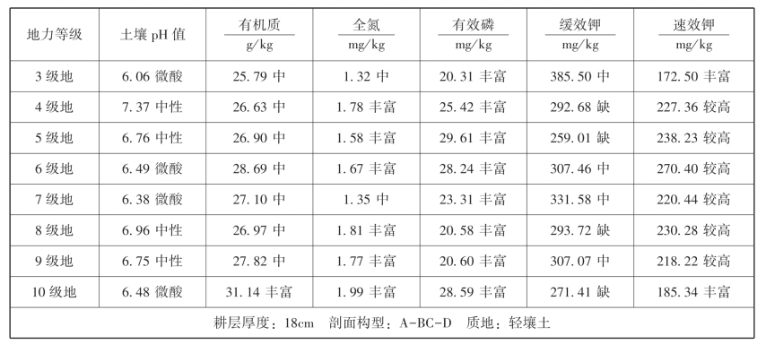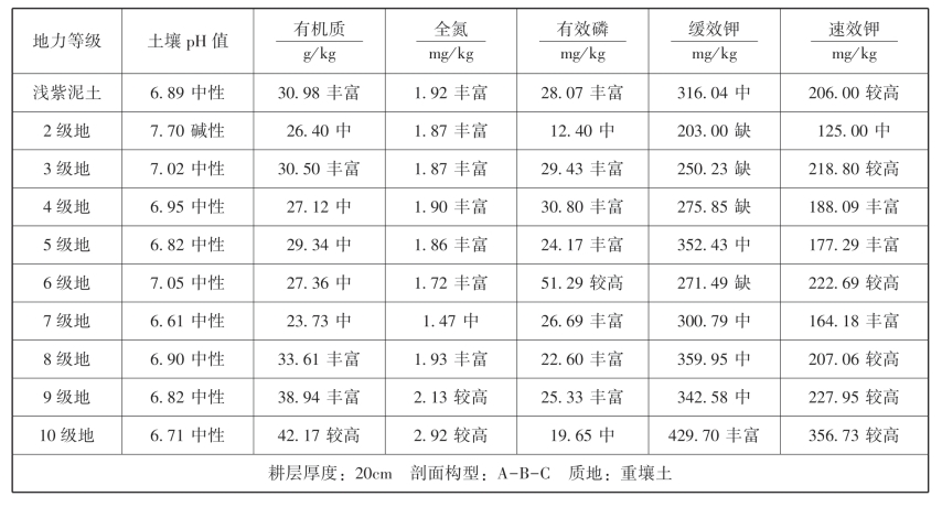 浅紫泥土养分情况:呈中性,有机质含量丰富,全氮含量中,有效磷含量丰富,缓效钾含量中,速效钾含量较高。