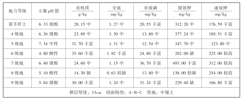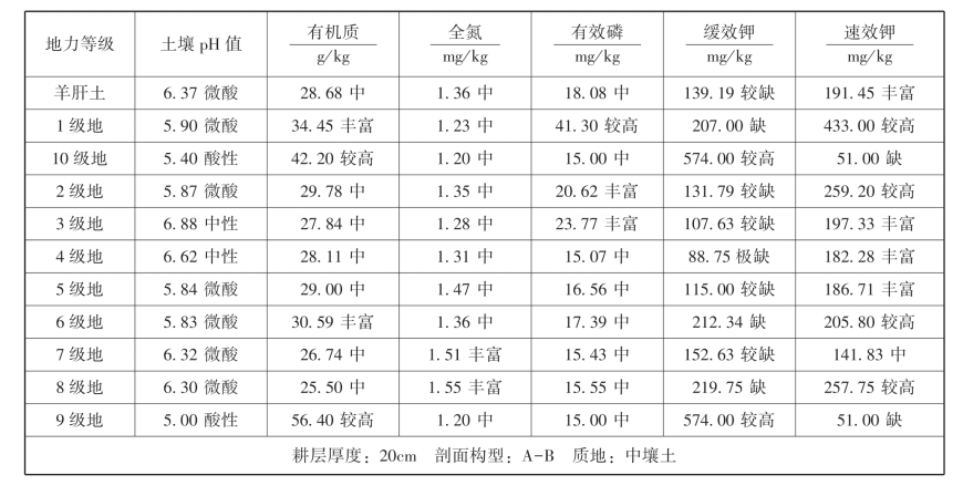 羊肝土养分情况:呈微酸,有机质含量中,全氮含量低,有效磷含量中,缓效钾含量较缺,速效钾含量丰富。