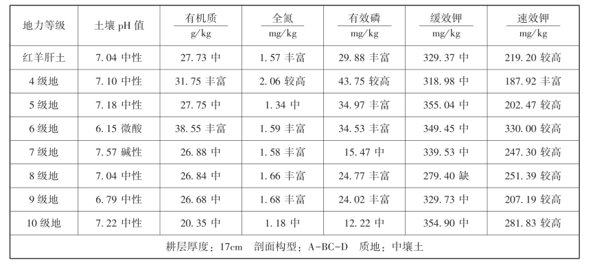 红羊肝土养分情况:呈中性,有机质含量中,全氮含量中,有效磷含量丰富,缓效钾含量较高,速效钾含量丰富。