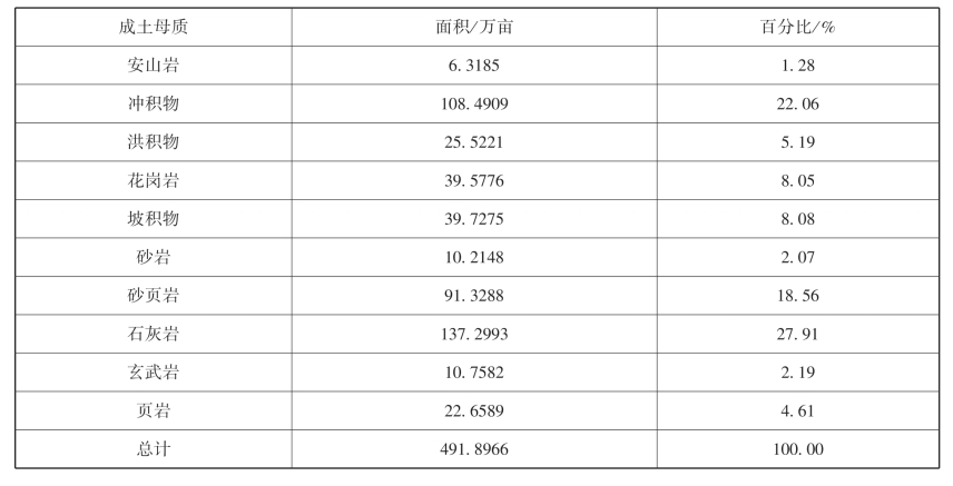 保山市成土母质有安山岩、冲积物、洪积物、花岗岩、坡积物、砂岩、砂页岩、石灰岩、玄武岩、页岩10种。其中石灰岩最多,面积有137.2993万亩,占总耕地面积的27.91%;其次是冲积物,面积有108.4909万亩,占总耕地面积的22.06%;安山岩分布面积最少,面积有6.3185万亩,占总耕地面积的1.28%。