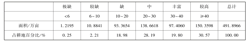耕地土壤有机质含量以较高为主,面积有150.3598万亩,占总耕地面积的30.57%;含量为丰富的面积有97.4060万亩,占总耕地面积的19.80%;含量为中的面积有138.6618万亩,占总耕地面积的28.19%;极缺至缺的面积有105.4689万亩,占总耕地面积的21.44%。