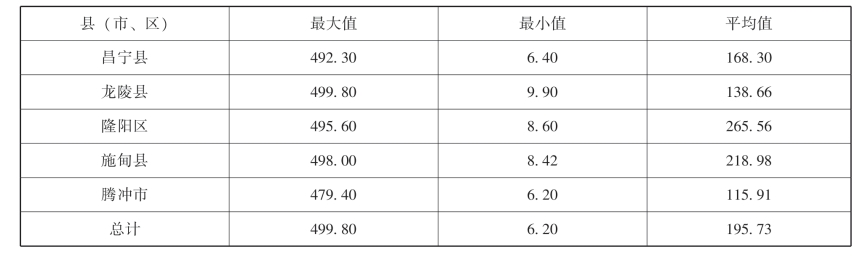 交换性镁含量最大值出现在龙陵县,最小值出现在腾冲市。平均值隆阳区最高(265.56mg/kg),腾冲市最低(115.91mg/kg)。