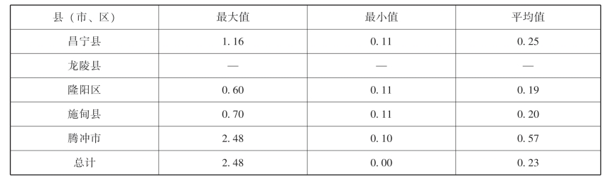 保山市耕地土壤有效钼含量在0.10~2.48mg/kg,平均值为0.23mg/kg。
