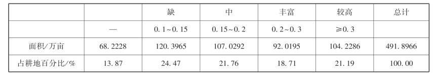 有效钼含量以缺少为主,面积有120.3965万亩,占总耕地面积的24.47%;含量丰富至较高的面积有196.2481万亩,占总耕地面积的39.90%;含量中的面积有107.0292万亩,占总耕地面积的21.76%。