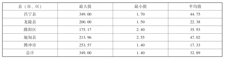 保山市耕地土壤有效锰含量在1.4~349mg/kg,平均值为32.89mg/kg。