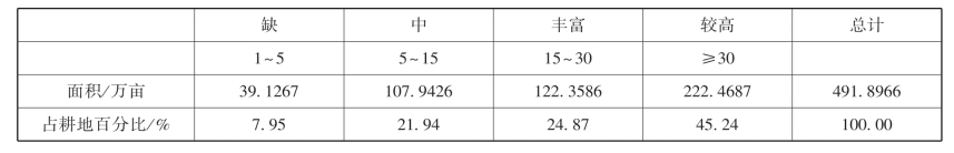 耕地土壤有效锰含量以较高为主,面积有222.4687万亩,占总耕地面积的45.24%;含量丰富的面积有122.3586万亩,占总耕地面积的24.87%;含量中的面积有107.9426万亩,占总耕地面积的21.94%;含量缺乏的有39.1267万亩,占总耕地面积的7.95%。