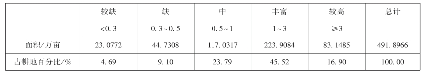 耕地土壤有效锌含量以丰富为主,有223.9084万亩,占总耕地面积的45.52%;含量较高的面积有83.1485万亩,占总耕地面积的16.90%;含量中的面积有117.0317万亩,占总耕地面积的23.79%;含量较缺至缺的面积有67.8080万亩,占总耕地面积的13.79%。