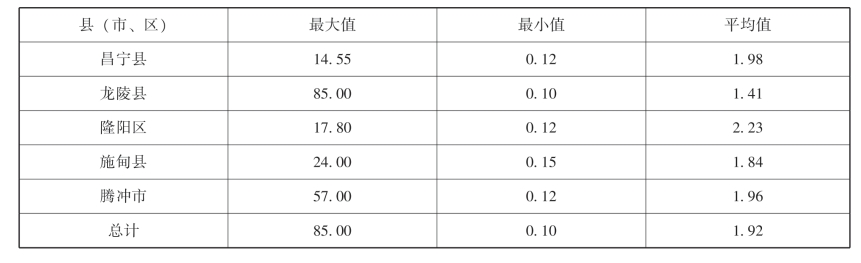 有效锌含量最大值出现在龙陵县,最小值出现在龙陵县。平均值隆阳区最高(2.23mg/kg),龙陵县最低(1.41mg/kg)。