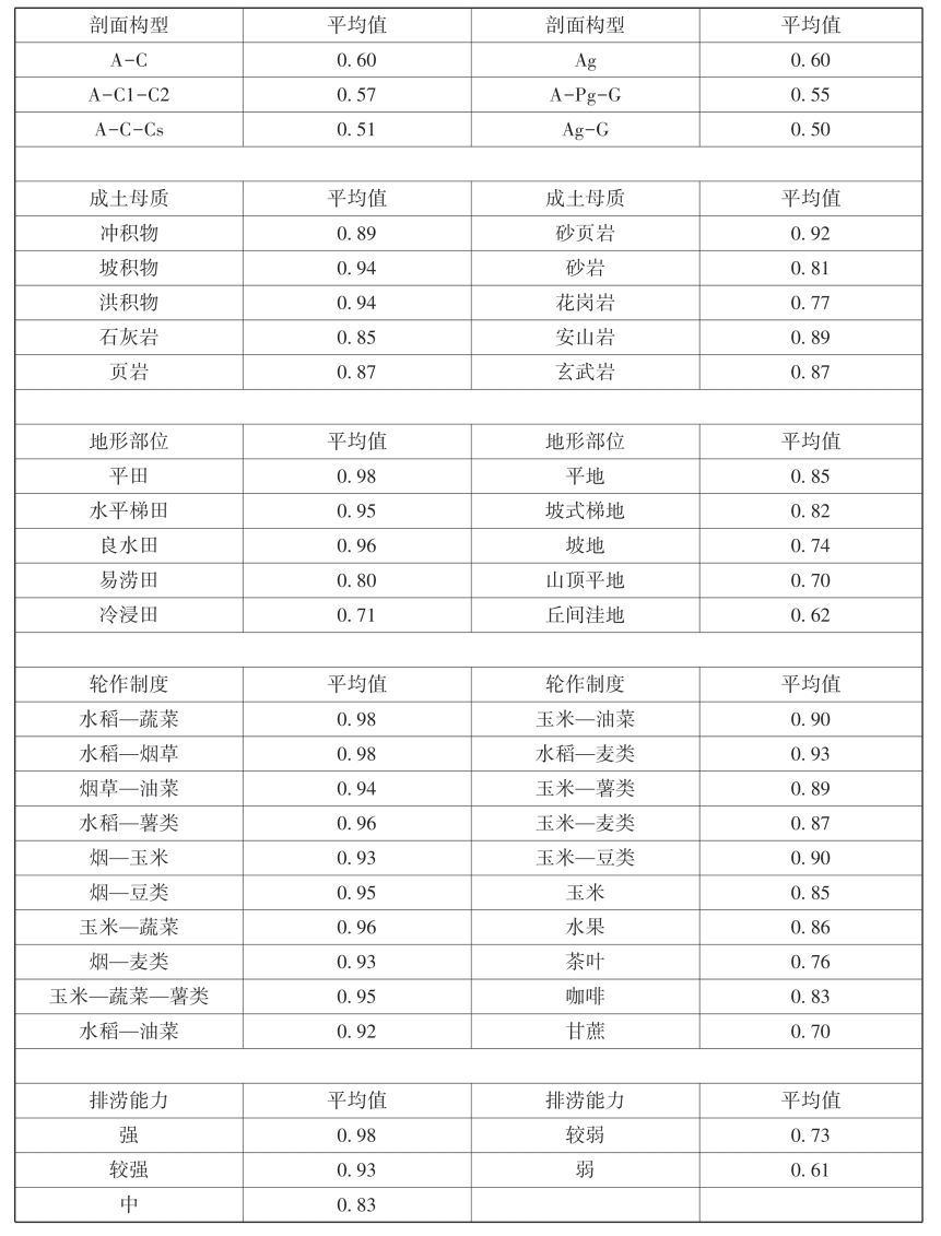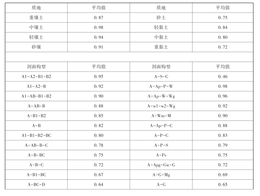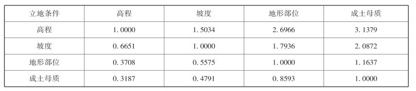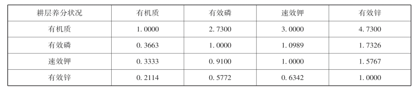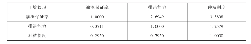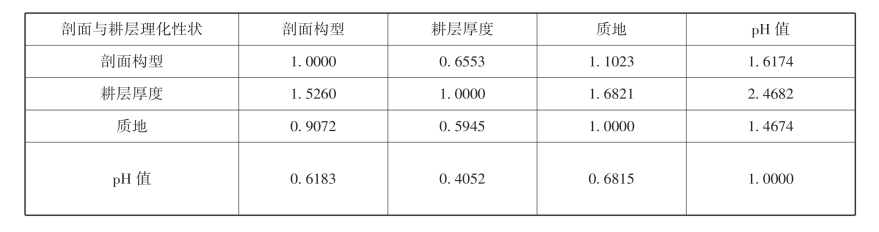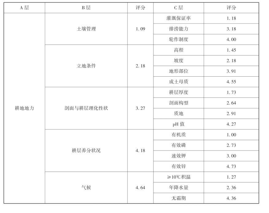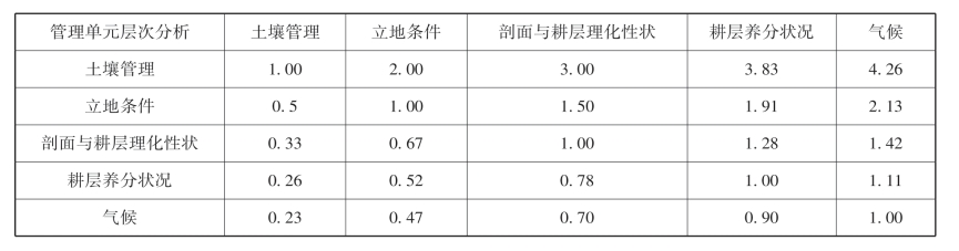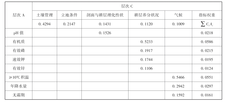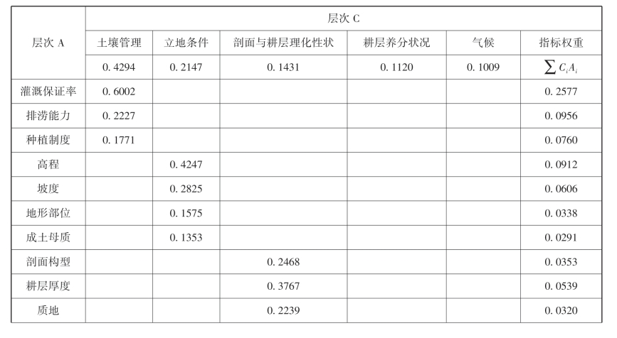 c.各层次要素权重系数计算。专家综合评定各层次指标对耕地地力的影响程度,分别对准则层和指标层各项指标进行权重打分。