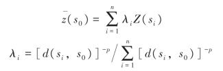 式中(s0)为附加点的估计值,Z(Si)为i处的实际观测值,λi为权重值,d(Si,S0)是指第i个观测点与估计点间的距离,指数p用来控制权重值随距离变化的速度,当指数增加时距离远的观测点权重值则会下降,p的取值范围一般为1、2、3,其中2最为常用。