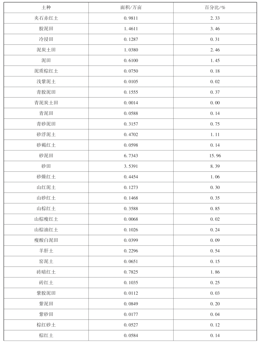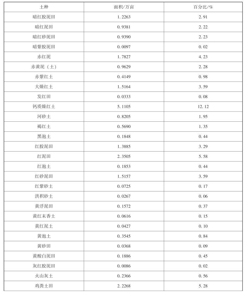 耕作土种有暗红胶泥田、暗红泥田、赤紫红土、大燥红土、发红田、钙质燥红土、河砂土、褐红土、黑泡土、红紫砂土、灰红胶泥田、火山灰土、浅紫泥土、青胶泥田、青泥炭土田、青泥田、青砂泥田、砂浮泥土、砂褐红土、砂泥田、砂田、砂燥红土、山棕油红土、瘦酸白泥田、羊肝土、窑泥土、砖暗红土、砖红土、紫胶泥田、棕黄油红土、棕油红土等61个土种。其中砂泥田最多,耕地面积有6.7343万亩,占本级耕地的15.96%。