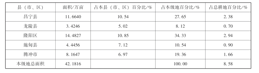 二级耕地主要分布在隆阳区和昌宁县。其中隆阳区面积有14.4828万亩,占本级地的34.33%,占本区的10.85%;昌宁县面积有11.6640万亩,占本级地的27.65%,占本县的10.54%。