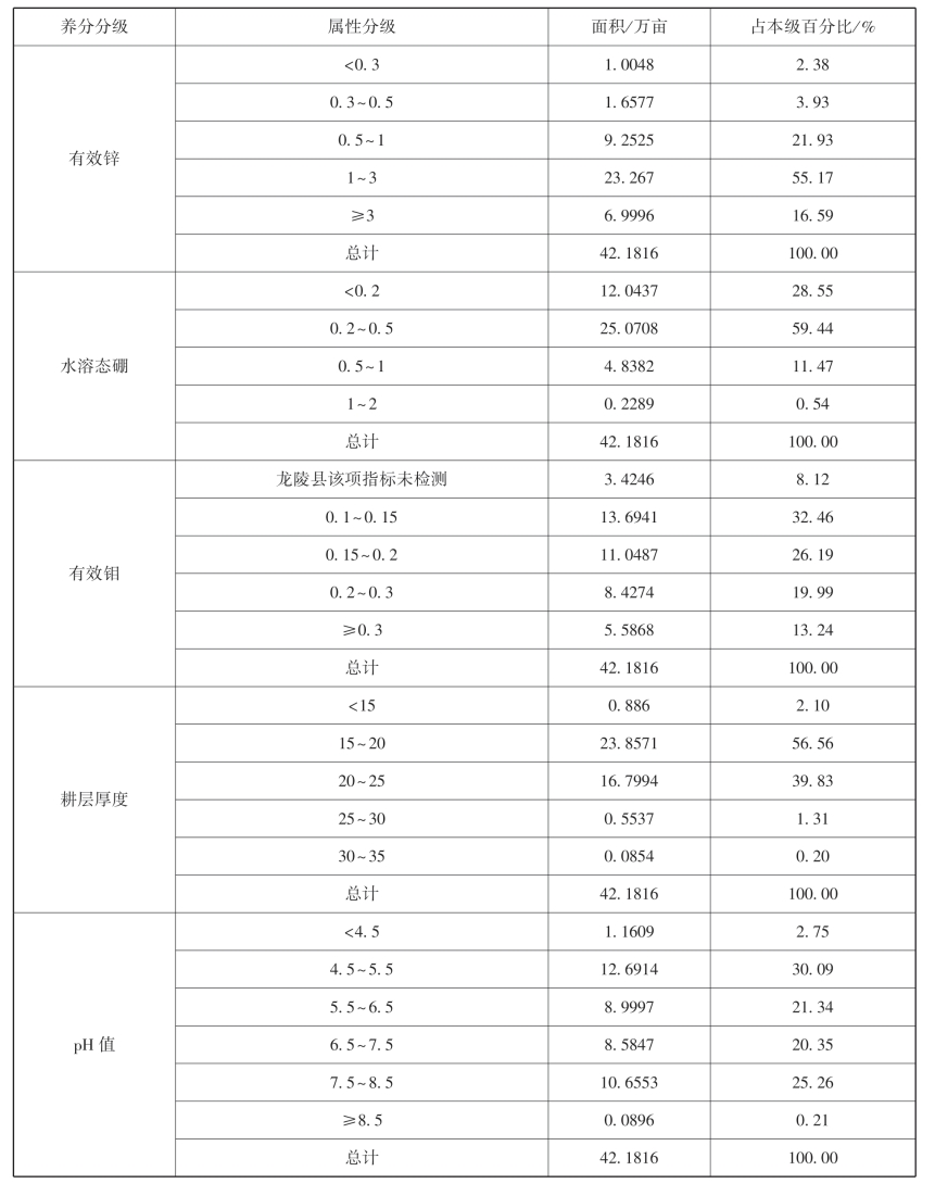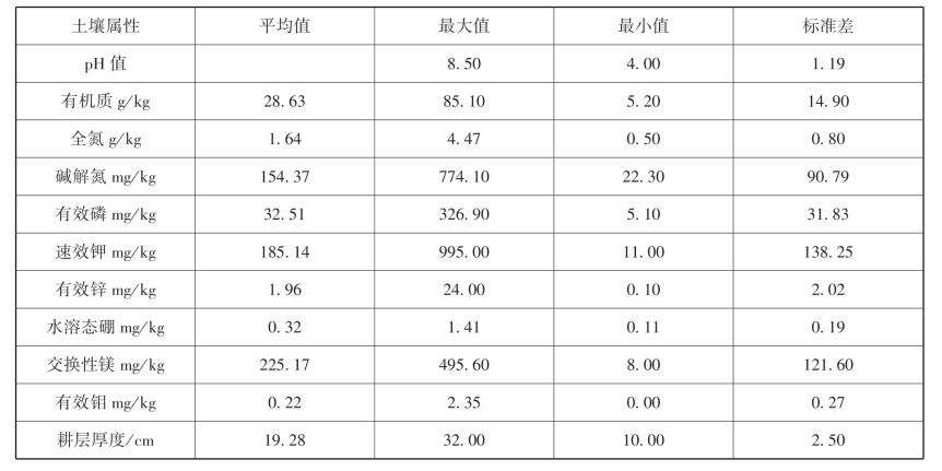 土壤属性情况:有机质平均值28.63g/kg;为全氮平均值为1.64g/kg;碱解氮平均值为154.37mg/kg;有效磷平均值为32.51mg/kg;速效钾平均值为185.14mg/kg;有效锌平均值为1.96mg/kg;水溶态硼平均值为0.32mg/kg;交换性镁平均值为225.17mg/kg;有效钼平均值为0.22mg/kg;耕层厚度平均值为19.28cm。
