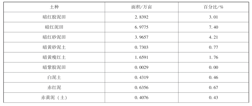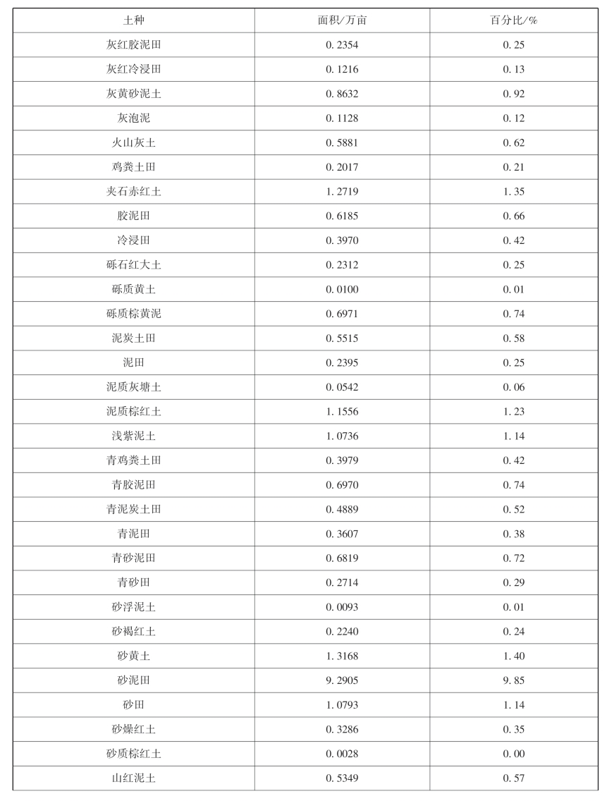 耕作土种有暗紫胶泥田、发红田、洪积砂土、黄红泥土、黄泥、黄泡土、砾质棕黄泥、泥炭土田、泥田、泥质灰塘土、泥质棕红土、青砂泥田、砂泥田、砂田、砂燥红土、砂质棕红土、山红泥土、山砂红土、山棕红土、棕褐红土、棕红砂土、棕红土、棕黄红泥土、棕黄红土、棕黄泥土、棕黄油红土、棕油红土等98个土种。其中砂泥田最多,面积有9.2905万亩,占本级耕地的9.85%。