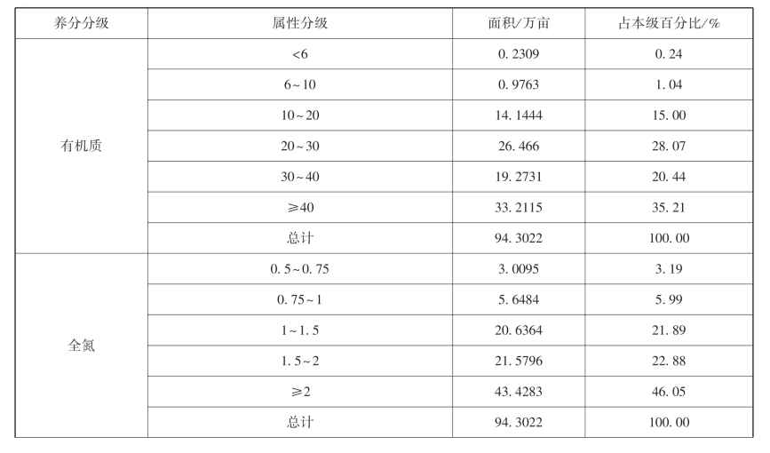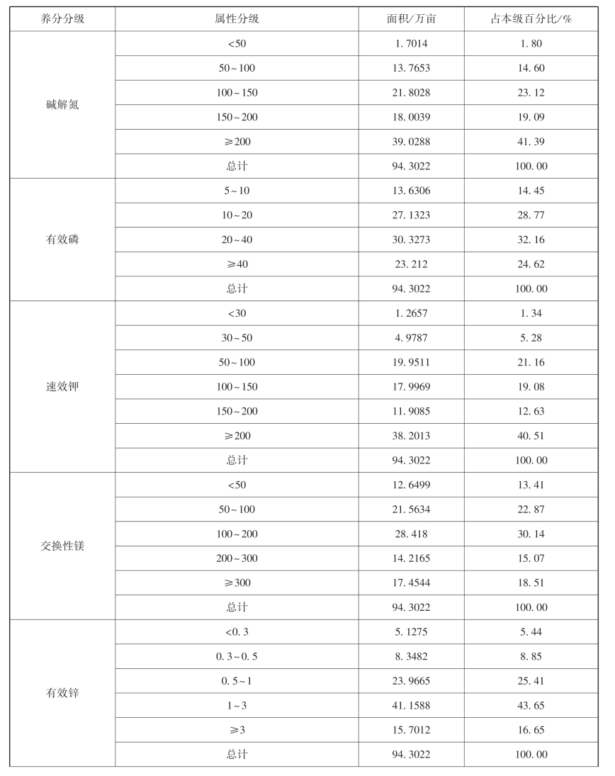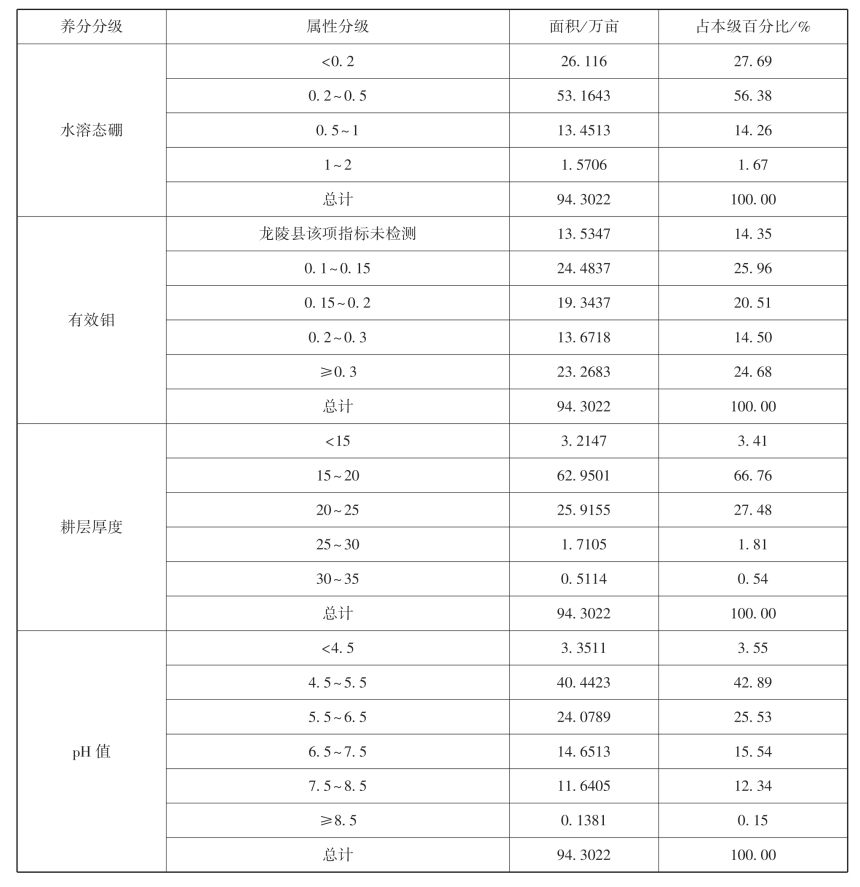 土壤属性情况:有机质平均值为35.25g/kg;全氮平均值为2.01g/kg;碱解氮平均值为189.58mg/kg;有效磷平均值为31.47mg/kg;速效钾平均值为206.94mg/kg;有效锌平均值为1.79mg/kg;水溶态硼平均值为0.35mg/kg;交换性镁平均值为183.70mg/kg;有效钼平均值为0.26mg/kg;耕层厚度平均值为18.68cm。
