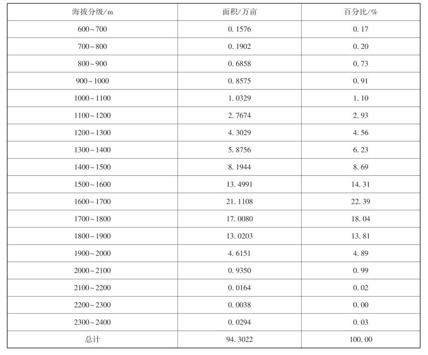 海拔范围为600~2400m,本级地主要分布在1500~1900m,面积有64.6382万亩,占本级耕地的68.55%。详见下表。