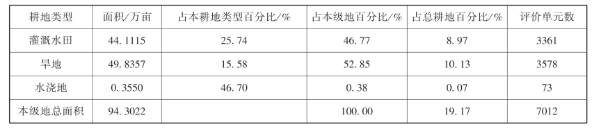 本级耕地主要分布在海拔1500~1900m的河流低阶地和起伏河流高阶地上。属保山市中肥力农田,主要由灌溉水田(占本级地的46.78%)和旱地(占本级地的52.85%)组成。本级地土层厚、坡度小、质地结构差,气候条件中等。土壤养分含量丰富,灌溉条件较好,能排能灌。作物一年一熟或两熟,产量中高产。