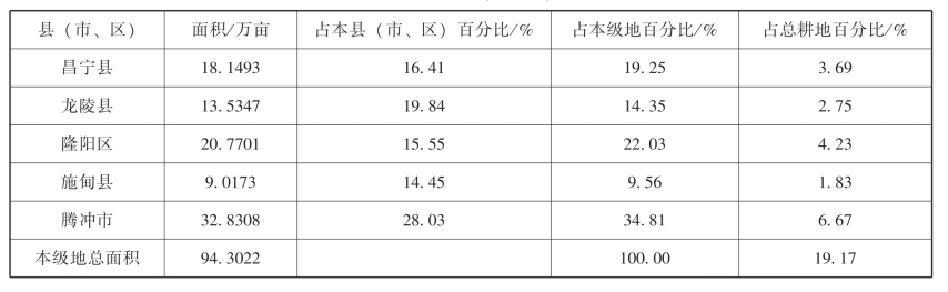 四级耕地:腾冲市有32.8308万亩,占本级地的34.81%,占保山市的28.03%;隆阳区有20.7701万亩,占本级地的22.03%,占本区的15.55%。