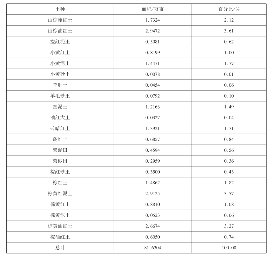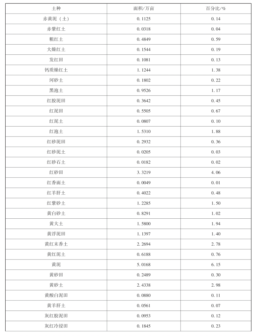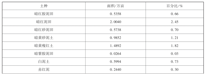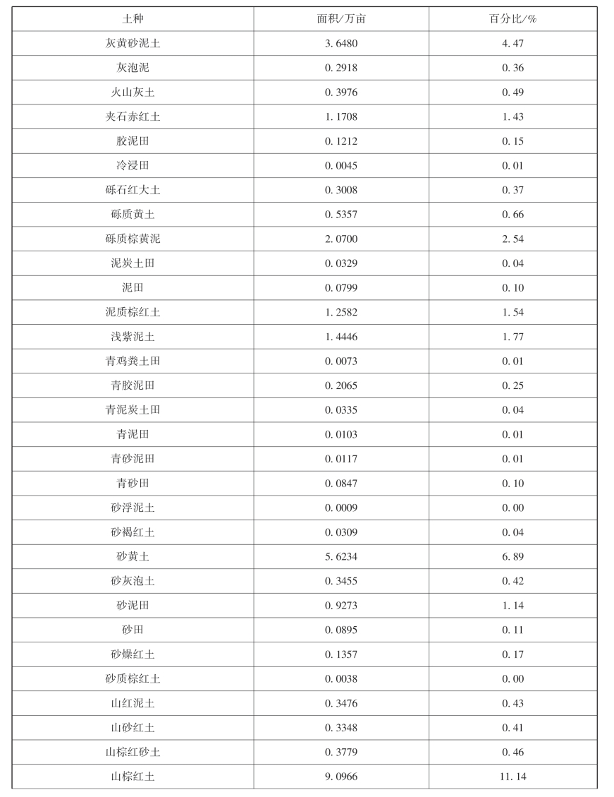 耕作土种有暗红胶泥田、红砂泥土、红砂石土、红砂田、红香面土、红羊肝土、红紫砂土、黄白砂土、黄大土、灰泡泥、火山灰土、夹石赤红土、胶泥田、冷浸田、砾石红大土、砂浮泥土、砂褐红土、砂黄土、山棕红土、山棕瘦红土、山棕油红土、羊肝土、羊毛砂土、窑泥土、油红大土、砖暗红土、砖红土、紫泥田、紫砂田、棕黄油红土、棕油红土91个土种。其中山棕红土最多,面积有9.0966万亩,占本级耕地的11.14%。