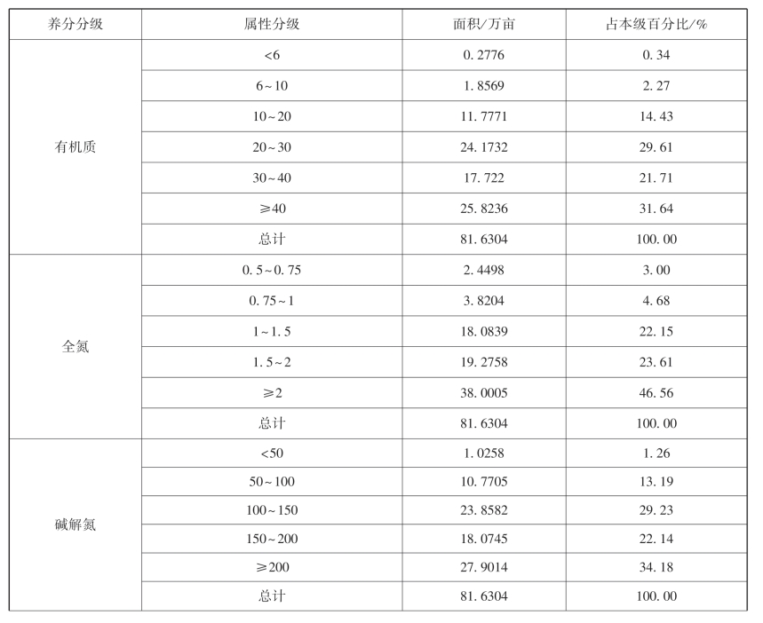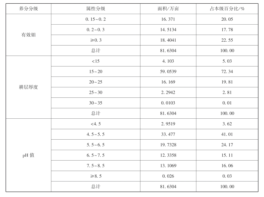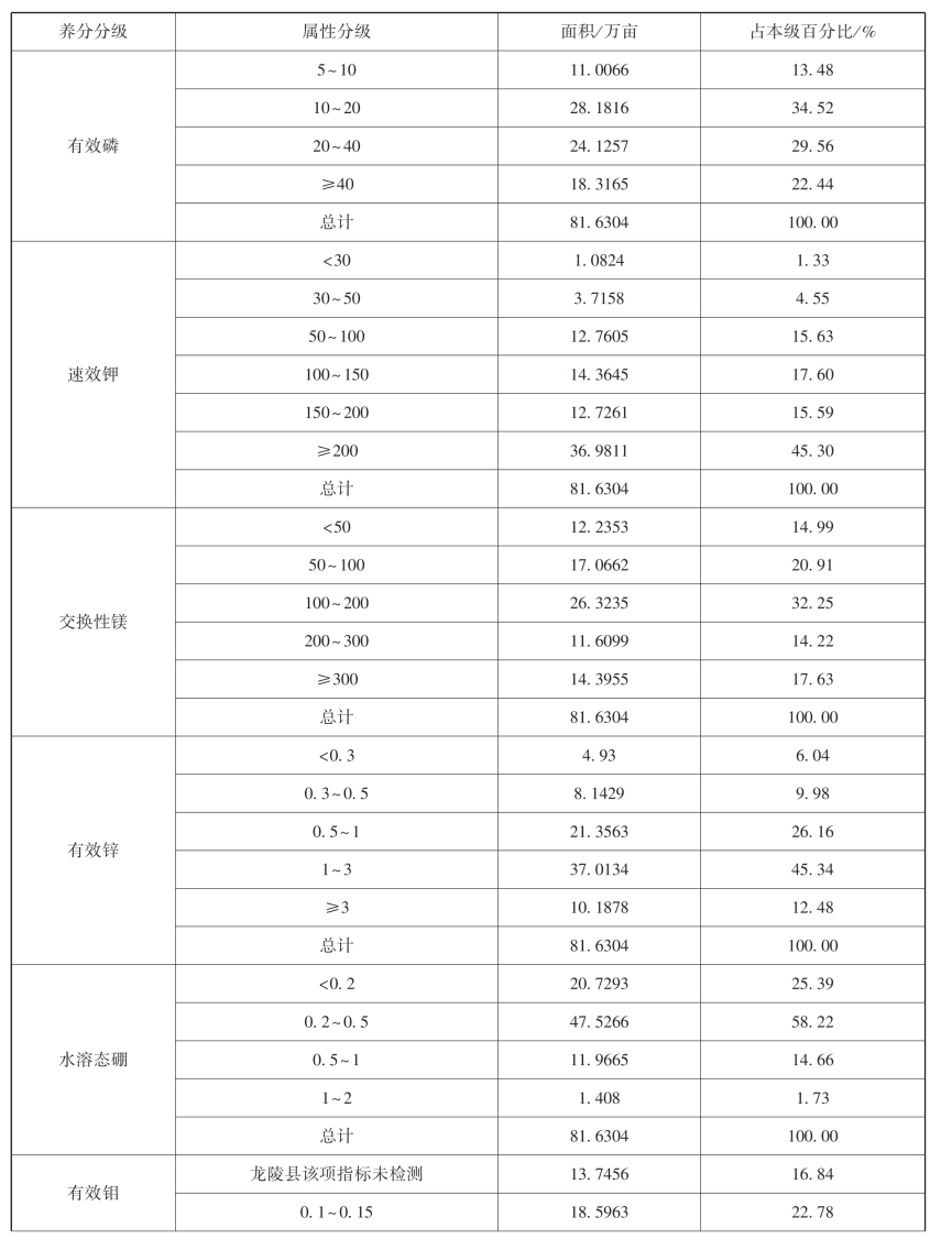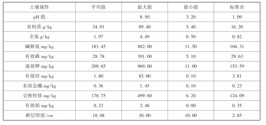 土壤属性情况:有机质平均值为34.01g/kg;全氮平均值为1.97g/kg;碱解氮平均值为183.45mg/kg;有效磷平均值为28.78mg/kg;速效钾平均值为209.65mg/kg;有效锌平均值为1.80mg/kg;水溶态硼平均值为0.36mg/kg;交换性镁平均值为178.75mg/kg;有效钼平均值为0.23mg/kg;耕层厚度平均值为18.08cm。
