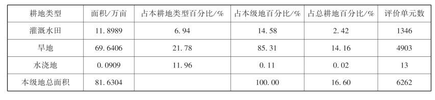 本级耕地主要分布在海拔1500~2100m的河流低阶地和起伏河流高阶地上。属保山市中肥力农田,耕地类型主要以旱地(占本级地的85.31%)为主。本级地土层厚、质地结构差。土壤养分含量丰富,灌溉条件较差,排涝能力中等。