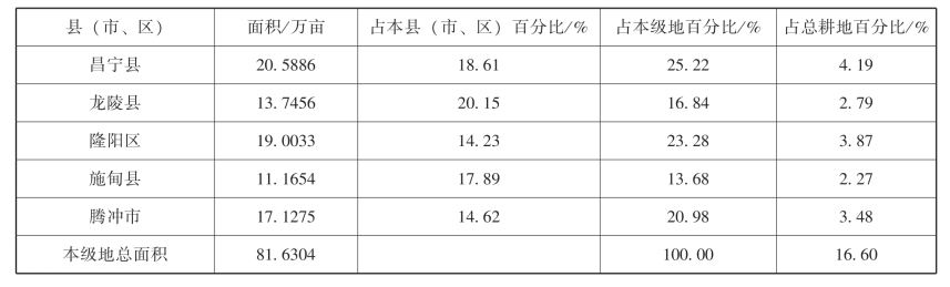 五级耕地:昌宁县面积有20.5886万亩,占本级地的25.22%,占本县的18.61%;隆阳区面积有19.0033万亩,占本级地的23.28%,占本区的14.23%。