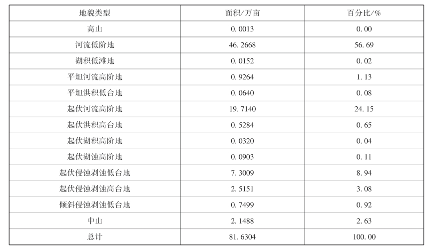地貌类型以河流低阶地为主和起伏河流高阶地为主,面积有65.9808万亩,占本级耕地的80.83%。