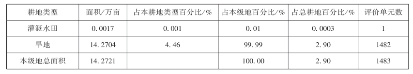 十级耕地面积有14.2721万亩,占总耕地面积的2.90%。由灌溉水田(0.0017万亩,占本级地的0.01%)和旱地(14.2704万亩,占总耕地面积的2.90%,占本级地的99.99%)组成。