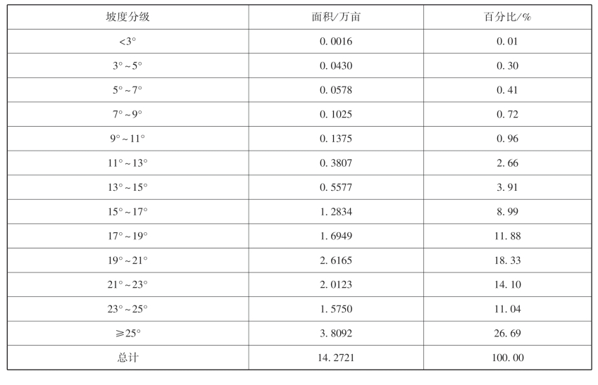 坡度范围为0°~47°,本级地主要分布在≥19°以上,面积有10.0130万亩,占本级地的70.16%。
