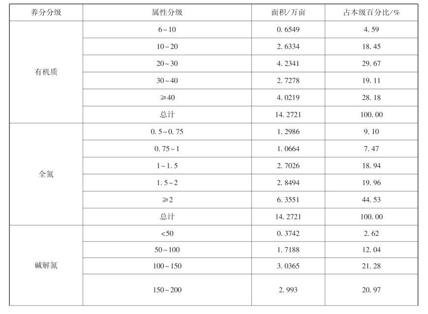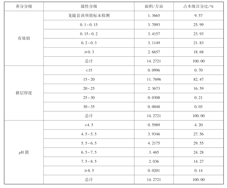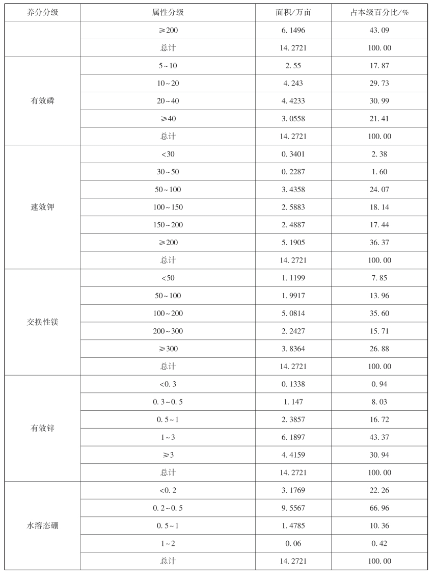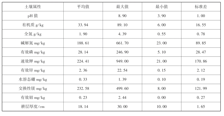 土壤属性情况:有机质平均值为33.94g/kg;全氮平均值为1.90g/kg;碱解氮平均值为188.61mg/kg;有效磷平均值为28.14mg/kg;速效钾平均值为224.41mg/kg;有效锌平均值为2.36mg/kg;水溶态硼平均值为0.33mg/kg;交换性镁平均值为232.58mg/kg;有效钼平均值为0.23mg/kg;耕层厚度平均值为18.14cm。