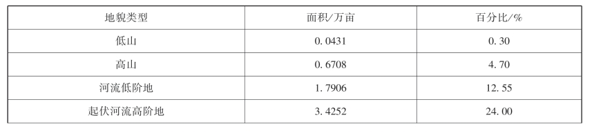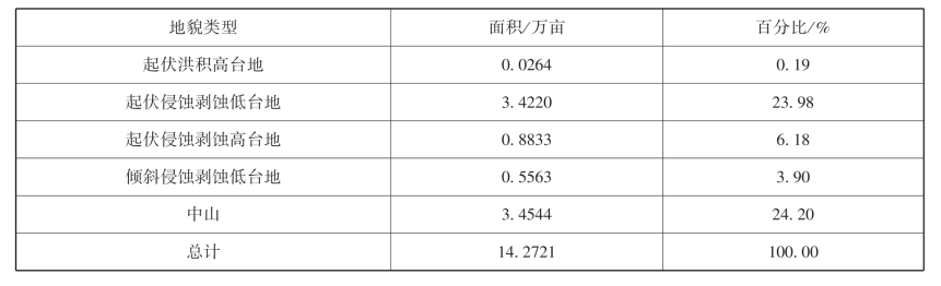 地貌类型以中山、起伏河流高阶地和起伏侵蚀剥蚀低台地为主,面积有10.3016万亩,占本级耕地的72.18%。