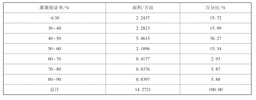 灌溉保证率为40%~50%的分布面积较广,面积有5.4615万亩,占本级耕地的38.27%。