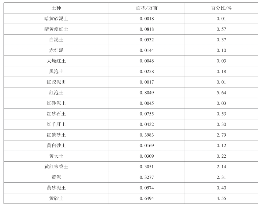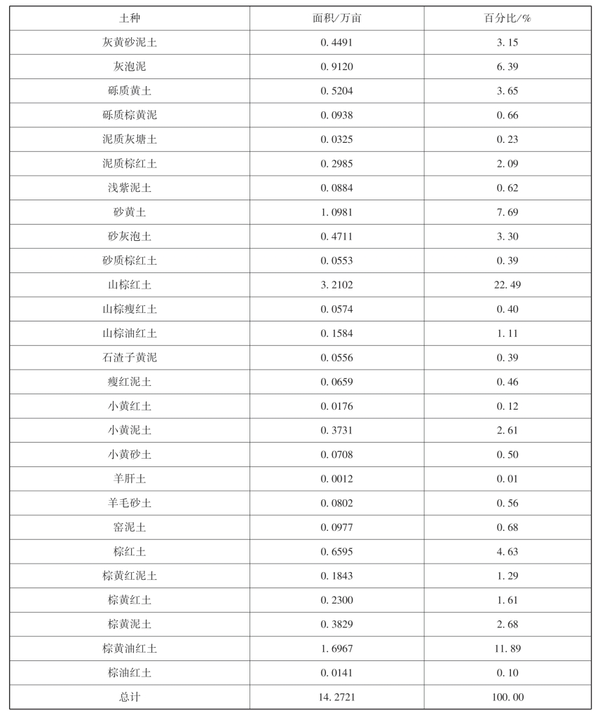 土种有黄大土、黄红末香土、黄泥、黄砂泥土、黄砂土、灰黄砂泥土、灰泡泥、砾质黄土、砾质棕黄泥、泥质灰塘土、山棕红土、小黄红土、小黄泥土、小黄砂土、羊肝土、羊毛砂土、窑泥土、棕红土、棕黄油红土、棕油红土45个土种。其中山棕红土最多,面积有3.2102万亩,占本级耕地的22.49%。