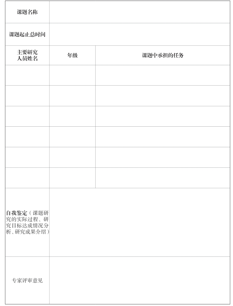 5.课题材料一式3份,学校1份、县(市)教研室2份(均须加盖学校和教研室公章)。装订顺序:课题申请书——阶段性材料——结题报告——指导教师(学生课题负责人)意见。