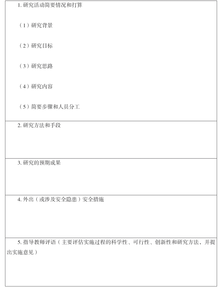 研究性学习教育活动可在科学领域、人文领域以及设计与制作领域逐步开展数学建模、青少年科技创新、课题研究等一系列活动,课题研究范围主要是科学领域、人文领域、设计制作,可以涉及科学考察探究、社会和生活观察、人文地理等,分为读书报告、社会调查、观察记录、参观访谈、实验研究、设计制作6类。活动分课题申请及备案、课题研究实施、课题总结和报告撰写、成果评选和奖励四个阶段。