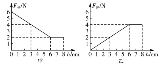 甲图:弹簧测力计的示数与深度的关系;乙图:浮力的大小与深度的关系。