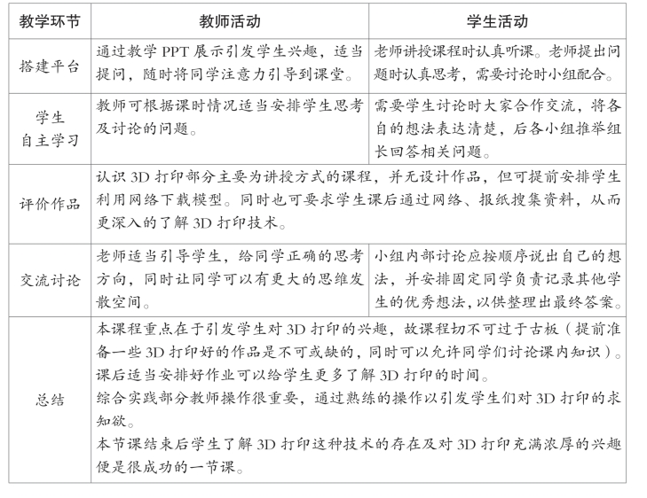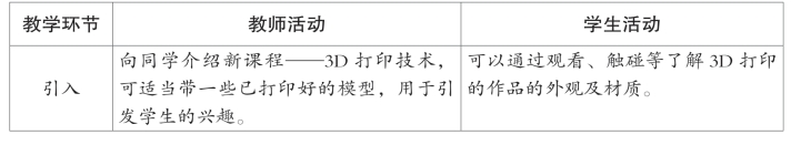 本单元共设计1学时,课前应准备一些打印好的3D模型(教学教具模型、生活用品模型、文物建筑物仿真模型等)供学生理解3D打印的作品样式。