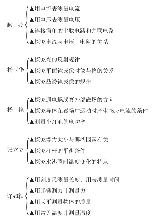 本工作室各成员主要负责3~4个实验的研究(具体分工见下表),收集、甄选每个实验至少3道近3年的中考物理试题建立实验题库,对实验中常见的几种实验思想方法、科学探究要素作概述性归纳、分析和总结。选题建库研究时间为2015年5—10月。