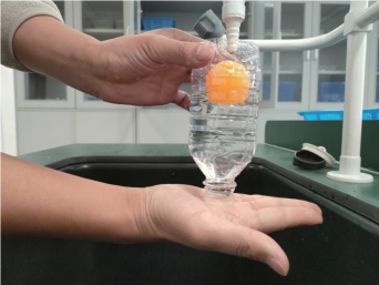 如果我们把一个乒乓球放入水中,根据实际生活现象,乒乓球水中会浮起来。但是,在水中的乒乓球不一定会浮起来。水会产生浮力其根本原因是浸入水中的物体受水压作用,物体各方向所受压力由于浸入深度的不同而不相等,物体侧面所受压力相等互相平衡,物体底部所受压力大于顶端压力,产生了竖直方向上的压力差。这个压力差就是宏观视角的浮力。如果竖直方向上没有压力差,乒乓球将不会浮起。本实验即通过明显的实验现象告诉同学们,在水中的物体,如果竖直方向上无压力差,将不会受到浮力作用。