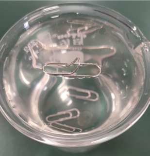 如果将一枚回形针随意丢入水中,我们可以观察到这枚回形针将沉到水底。显然,回形针所受的浮力小于自身所受重力,所以回形针会沉到水底。但是如果我们小心翼翼的将回形针水平放置到水面上,我们就会观察到回形针“站”在了水面上。这是由于回形针受到了水表面张力的作用,表面张力就好似一张蹦蹦床一样的网,“托”住了回形针,就出现了这样奇妙的现象。