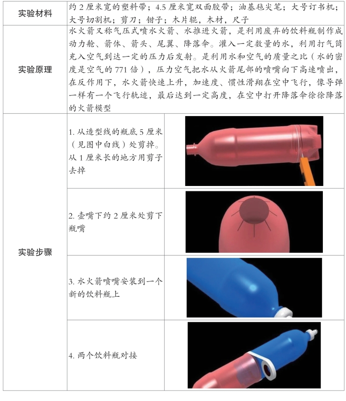 水火箭是一个利用质量比和气压作用而设计的玩具,而其中蕴含的物理原理是了解物理中力学的重要的基础。利用废弃的饮料瓶制作成动力舱、箭体、箭头、尾翼、降落伞。水火箭是寓教于乐、科技含量高,深受广大青少年喜爱的动手、动脑的科普教材。可以让学生直观了解导弹、运载火箭的发射升空、回收的过程,导弹的飞行与飞机的飞行原理及不同点。
