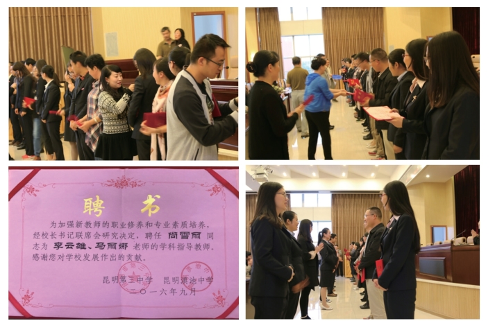 为了帮助青年教师走好三尺讲台第一步,推进学校的可持续发展,提高教师的专业化水平,昆明三中每年9月最重要的大事之一就是举行庄严、真挚而温馨的薪火相传拜师会。学校领导与会,宣读一对一师徒搭对名单,一位骨干教师带领一个青年教师。徒弟给师父鞠躬行礼,师父给徒弟戴上校徽,送上殷切的祝福和期望。教研组长给每位新教师赠书。这个活动是昆三中多年的传统,以帮助青年教师尽快适应新环境,融入三中大家庭,在教育之路上走稳,走好,走出新天地。通过新老教师的一对一结对拜师,不仅使骨干教师的丰富实践经验和爱岗敬业的优秀传统得以传递,还能用青年教师敢想敢做的创新精神给学校工作增添新的活力。新老教师在年龄上互补、经验上共享,使学校教师队伍建设稳步前进。