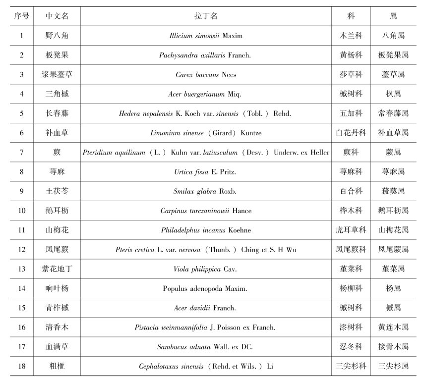由表可知,西康玉兰生活的群落植物分属17科18属18种。