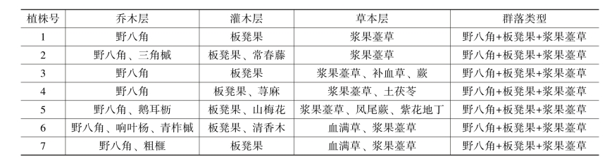 由表可知,西康玉兰的群落类型为野八角+板凳果+浆果薹草群落,其生活型为:共有伴生植物18种,其中,乔木层有6种,占33.33%,灌木层有5种,占27.78%,草本层有7种,占38.89%。